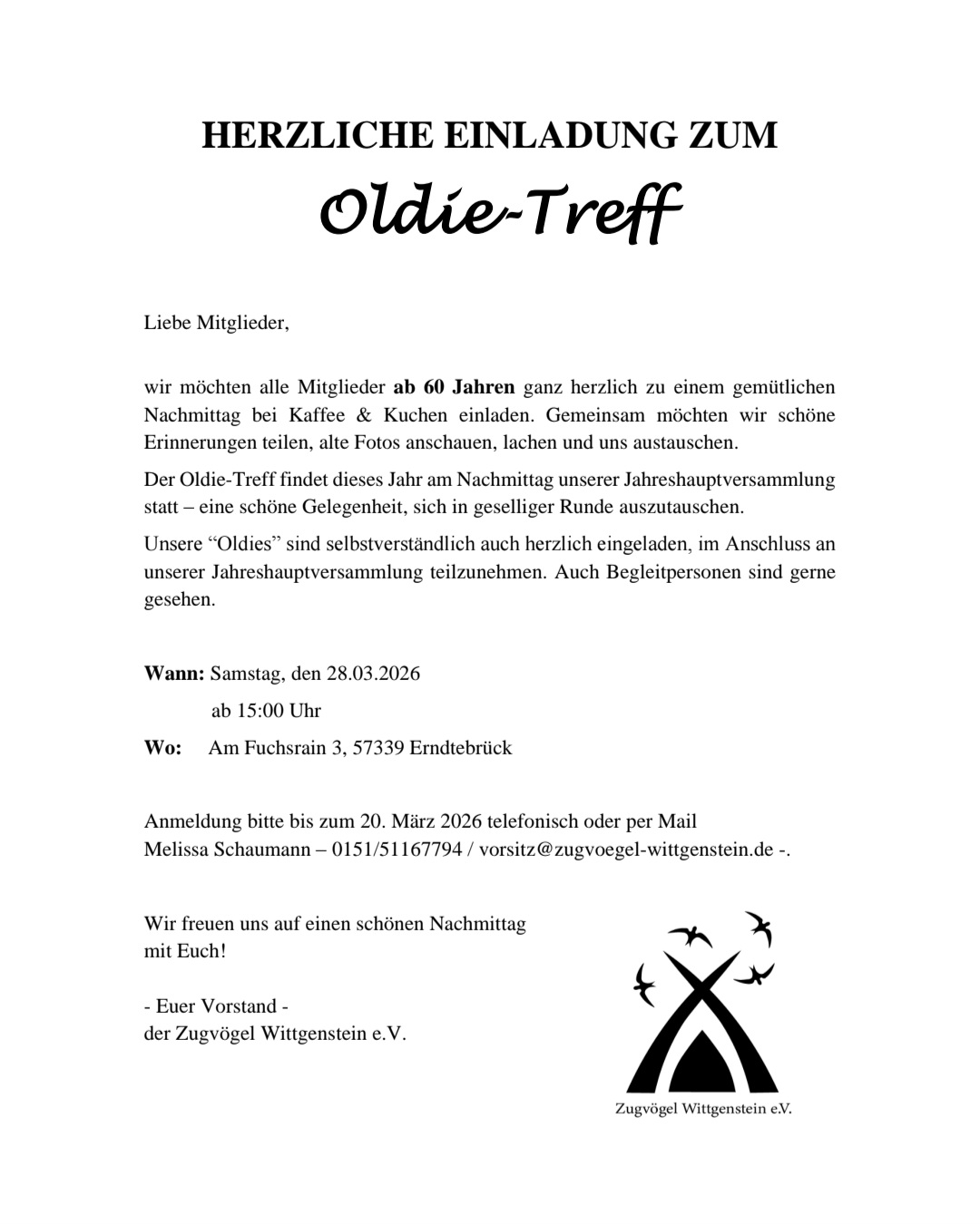 Damit wir besser planen können, bitten wir Euch, uns bis zum 20. März 2026 kurz mitzuteilen, ob Ihr am Oldie‑Treff teilnehmen werdet. Anmeldungen bitte telefonisch oder per E-Mail an Melissa Schaumann (0151/51167794 oder vorsitz@zugvoegel-wittgenstein.de).